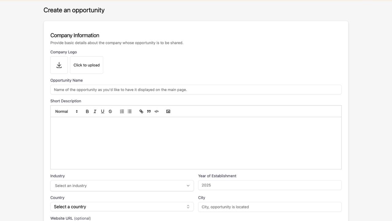 Then add opportunity details, set funding targets, upload necessary documentation, define investment terms.