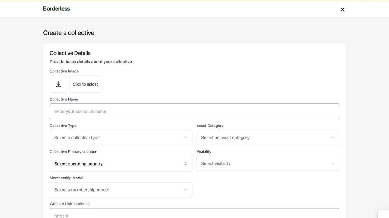 Before anything is created on the platform, you’ll need to fill out the Start a Collective form on the Borderless website at www.onborderless.com